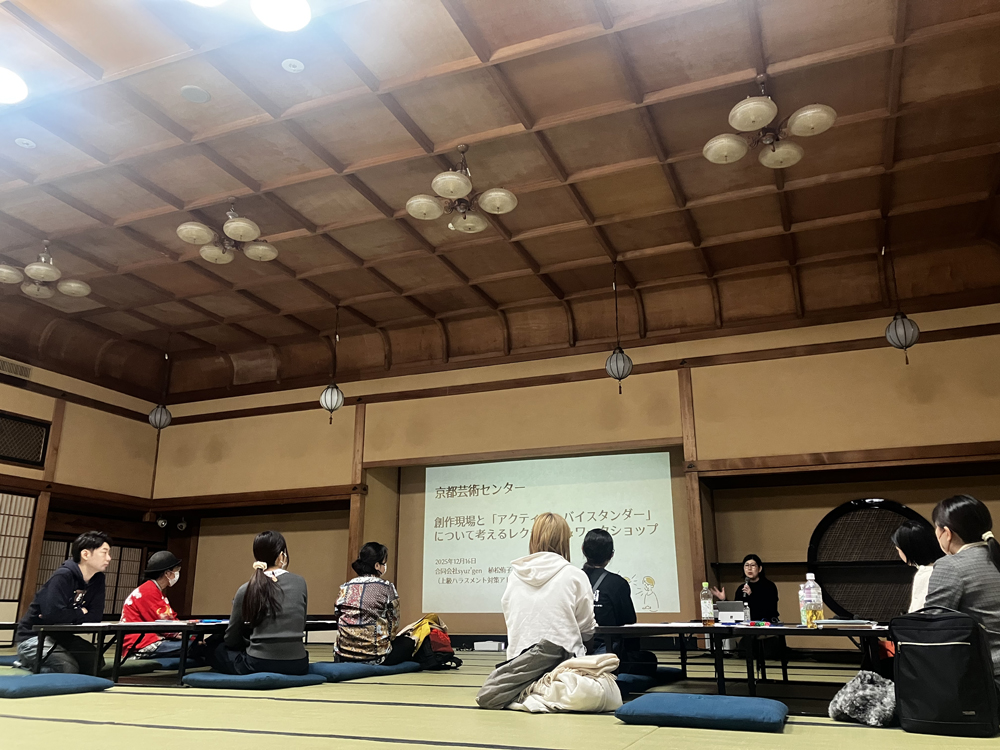 舞台芸術の制作や発表の場における必要な知識を学び、個々の実践のなかで粘り強く考え続けていくための機会として2022年度から京都芸術センターと共同主催しているレクチャー&ワークショップ企画。4回目となる本年度は、植松侑子さんを講師にお迎えし、「アクティブ・バイスタンダー」をテーマに開催しました。